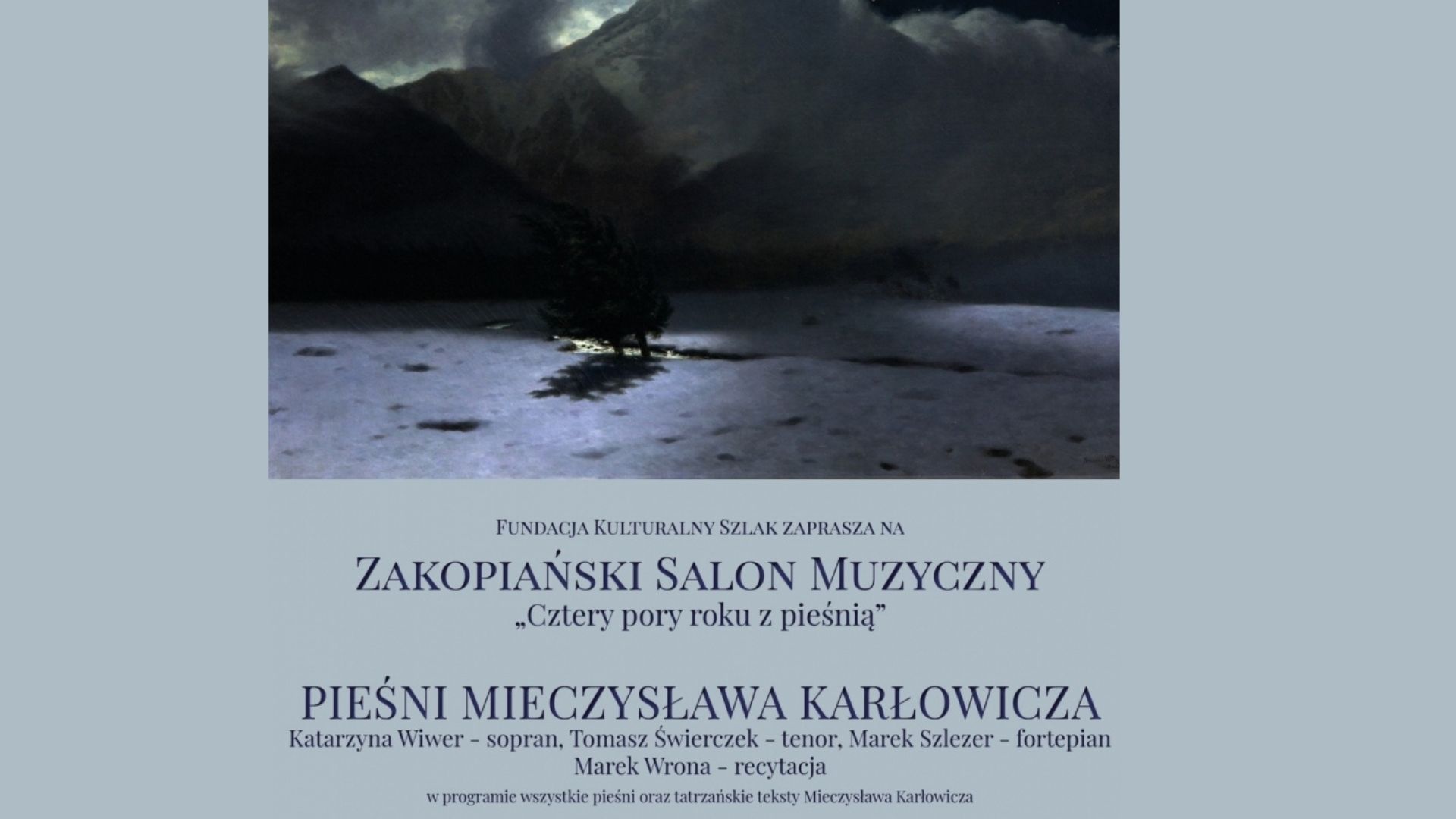 Artystami tego wieczoru będą krakowscy muzycy: Katarzyna Wiwer – sopran, Tomasz Świerczek – tenor, Marek Szlezer – fortepian, w programie wysłuchamy wszystkich pieśni Mieczysława Karłowicza; z muzyką będą korespondować teksty Karłowicza o Tatrach, które przeczyta aktor Teatru Witkacego Marek Wrona